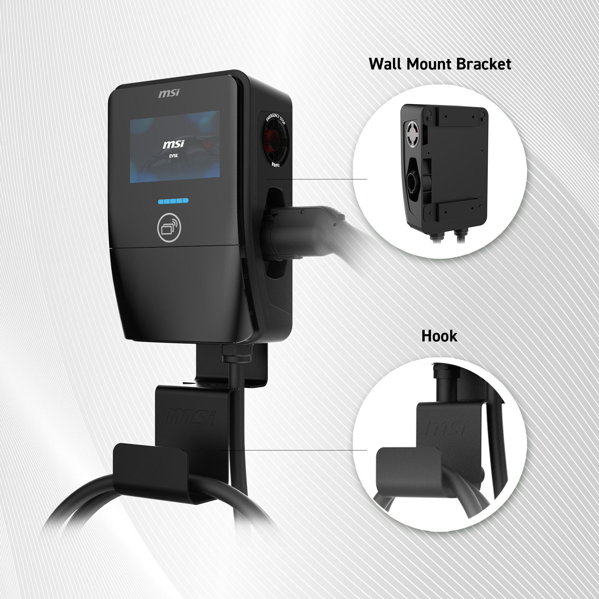 Mount your charger quickly and securely with the MSI EV Series home kit. The included brackets make it easy to install on any wall, indoors or outdoors. The metal cable hook keeps everything neat and tidy, for charging wherever it’s most convenient.