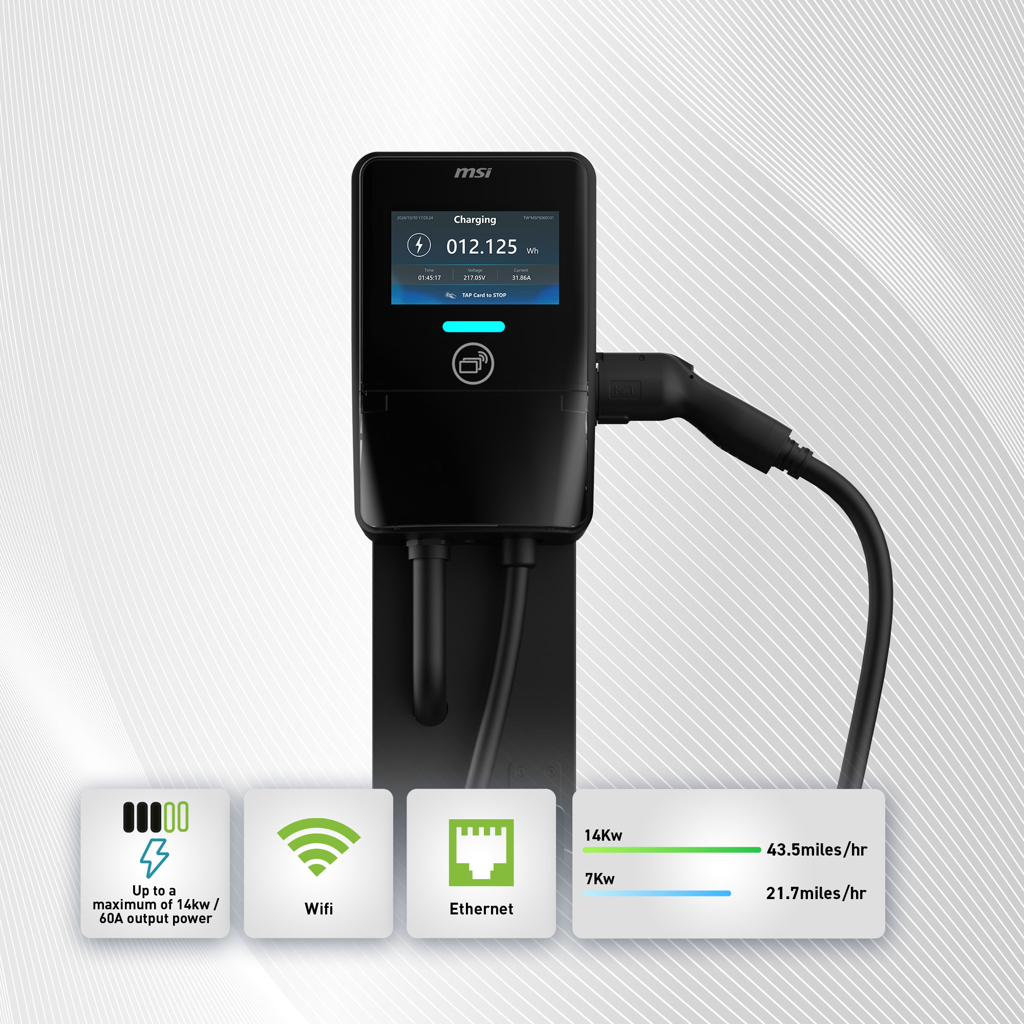 MSI EV Premium NACS NEMA 14-50 EV Charger deliver a complete smart charging experience for electric vehicle owners. Engineered for everyday excellence and long-term reliability, it pairs intelligent hardware with the MSI aConnect app for seamless control, at home or in shared communities. With a durable, weather-resistant build, easy installation, and easy management, EV Premium reflect our legacy of engineering excellence. Whether you're charging at home or work, trust MSI to power your journey, one charge at a time.