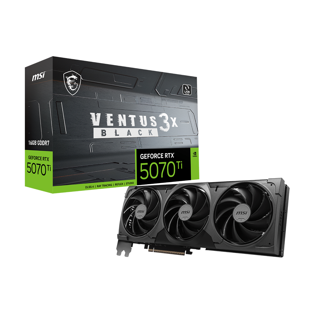 Powered by NVIDIA Blackwell, GeForce RTX 5070 Ti 16G VENTUS 3X BLACK bring game-changing capabilities to gamers and creators. Equipped with a massive level of AI horsepower, the RTX 50 Series enables new experiences and next-level graphics fidelity. Multiply performance with NVIDIA DLSS 4, generate images at unprecedented speed, and unleash your creativity with NVIDIA Studio.