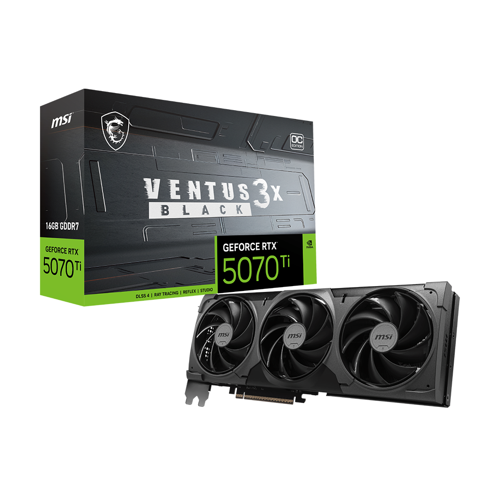 Powered by NVIDIA Blackwell, GeForce RTX 5070 Ti 16G VENTUS 3X OC BLACK bring game-changing capabilities to gamers and creators. Equipped with a massive level of AI horsepower, the RTX 50 Series enables new experiences and next-level graphics fidelity. Multiply performance with NVIDIA DLSS 4, generate images at unprecedented speed, and unleash your creativity with NVIDIA Studio.