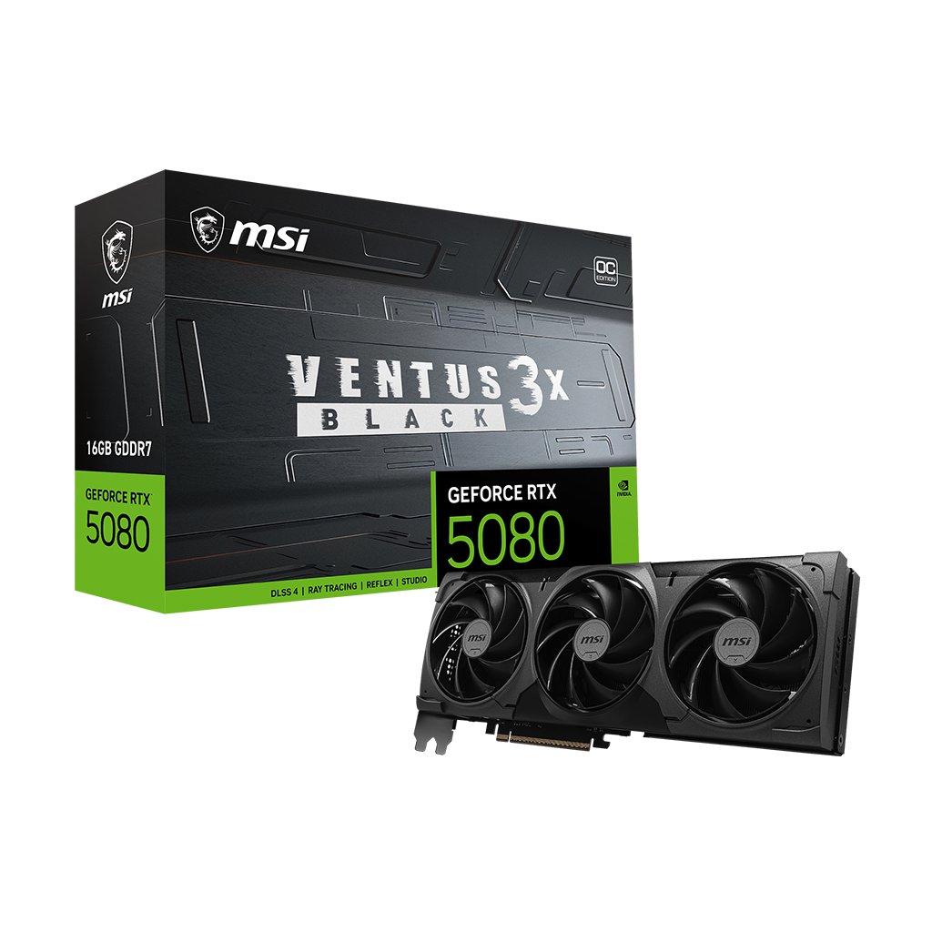 MSI GeForce RTX 5080 16G VENTUS 3X OC BLACK focuses on the essentials to tackle any challenge. Its efficient thermal solution is encased in a resilient enclosure with a neutral aesthetic, allowing this sleek graphics card to integrate seamlessly into any build.