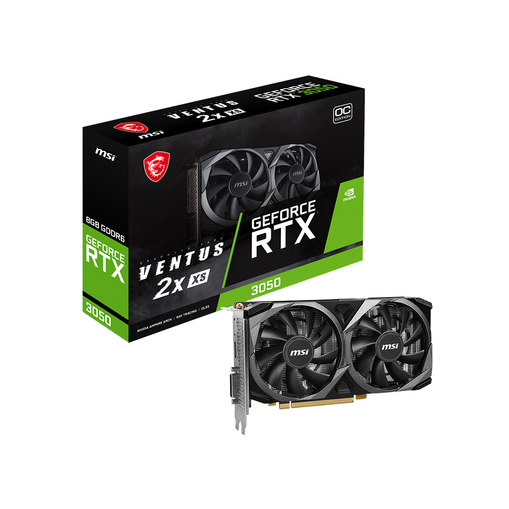 GeForce RTX 3050 VENTUS 2X XS 8G OC brings a performance-focused design that maintains the essentials to accomplish any task at hand. A capable triple fan arrangement laid into a rigid industrial design lets this sharp looking graphics card fit into any build.