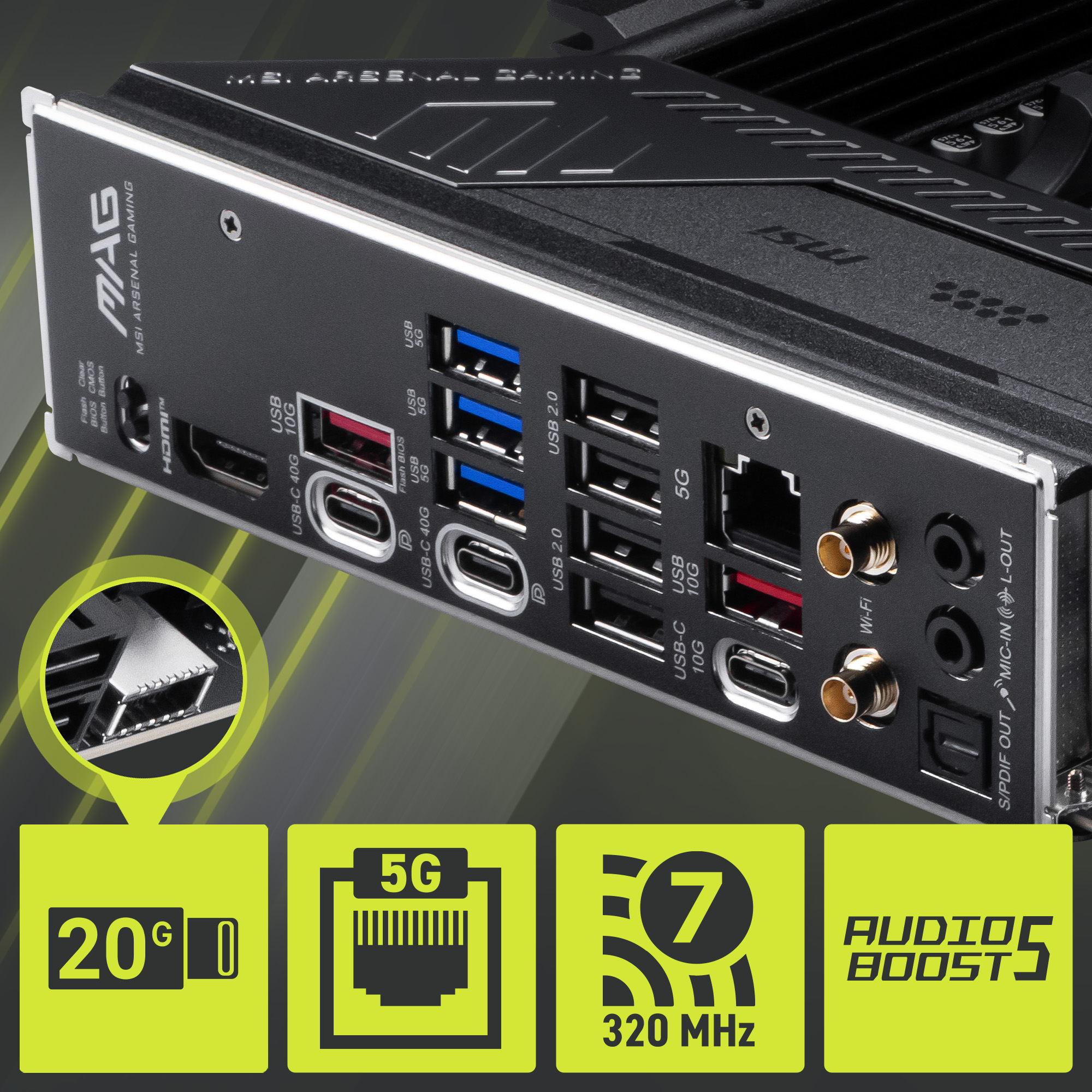 | I/O (Rear) | Clear CMOS Button USB 10Gbps Type-A USB 5Gbps Type-A USB 2.0 5G LAN Wi-Fi / Bluetooth Audio Connectors Flash BIOS Button HDMI™ USB 10Gbps Type-C USB 10Gbps Type-C USB 10Gbps Type-A Optical S/PDIF-OUT |