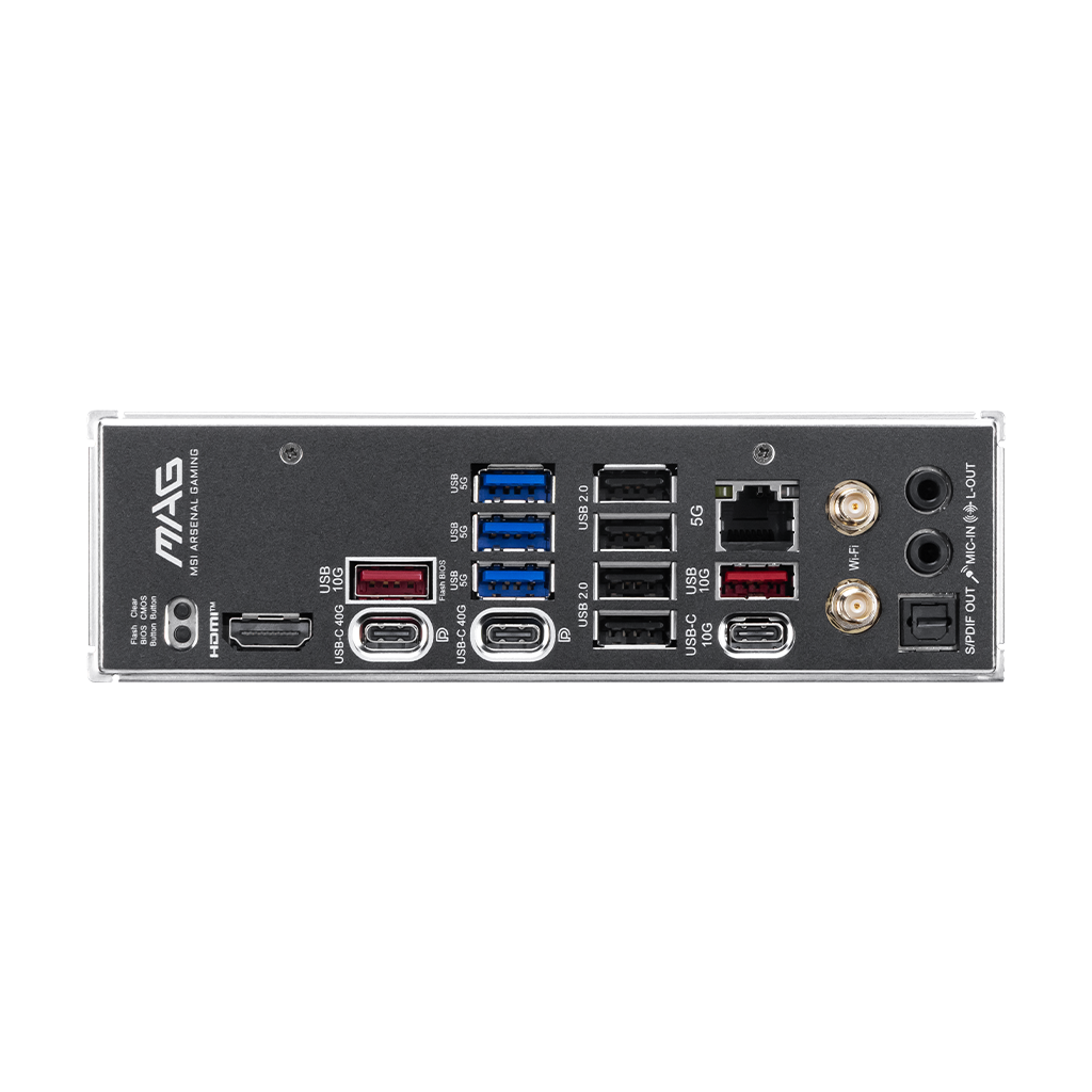 | I/O (Rear) | Clear CMOS Button USB 10Gbps Type-A USB 5Gbps Type-A USB 2.0 5G LAN Wi-Fi / Bluetooth Audio connectors Flash BIOS Button HDMI™ USB 40Gbps Type-C USB 10Gbps Type-C USB 10Gbps Type-A Optical S/PDIF-OUT |
