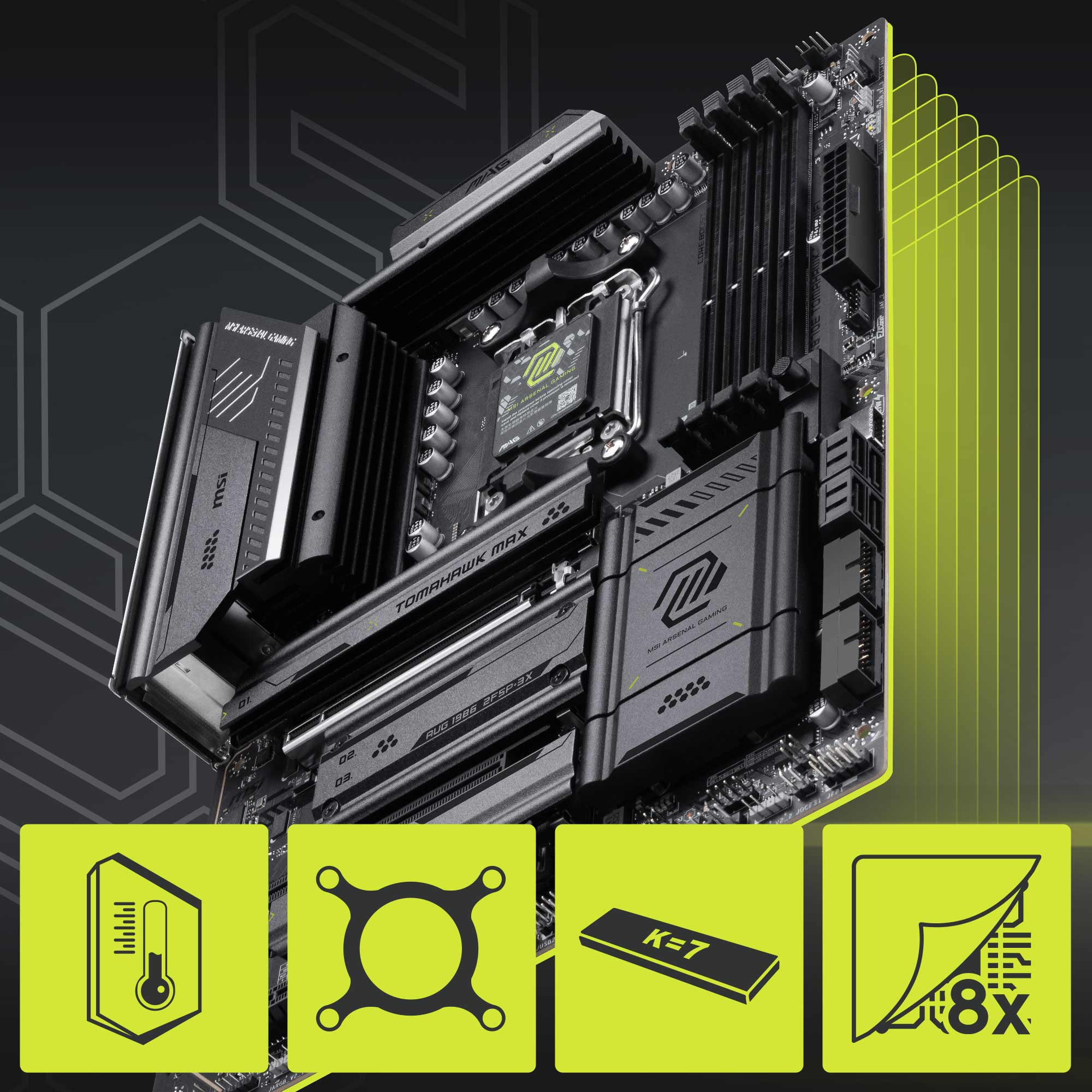 Frozr Guard: Extended Heatsink design, 7W/mK MOSFET thermal pads, extra choke thermal pads and M.2 Shield Frozr for improved thermal dissipation.