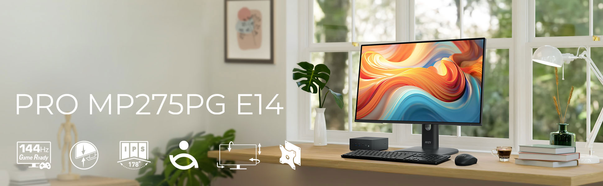 The PRO MP275PG E14 monitor combines a 144Hz refresh rate and Adaptive-Sync for smooth gaming and work. Its ergonomic design, PerfectEdge display, and HDR Ready feature enhance comfort and immersion, making it the perfect all-in-one solution.