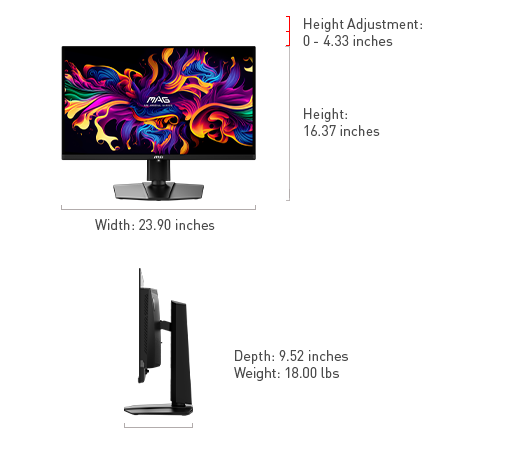 The MAG 271QP QD-OLED X28 features Quantum Dot technology, an elite color gamut (1.07 billion colors, 98% Adobe RGB / 138% sRGB / 99% DCI-P3 ), VESA DisplayHDR True Black 400 dynamic contrast & brightness and a 4-way adjustable stand.