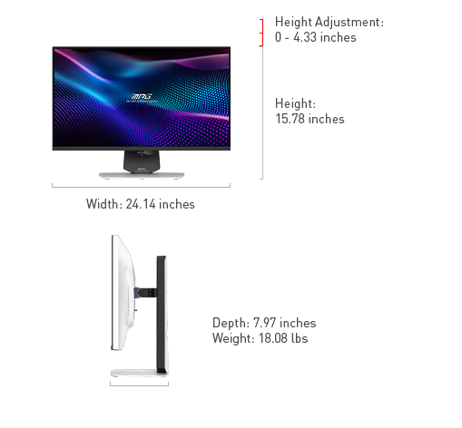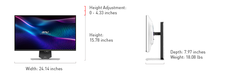 The MPG 274URDFW E16M features mini-LED technology, an elite color gamut (1.07 billion colors, 140% sRGB / 98% DCI-P3 ), VESA DisplayHDR 1000 dynamic contrast & brightness and a 4-way adjustable stand.