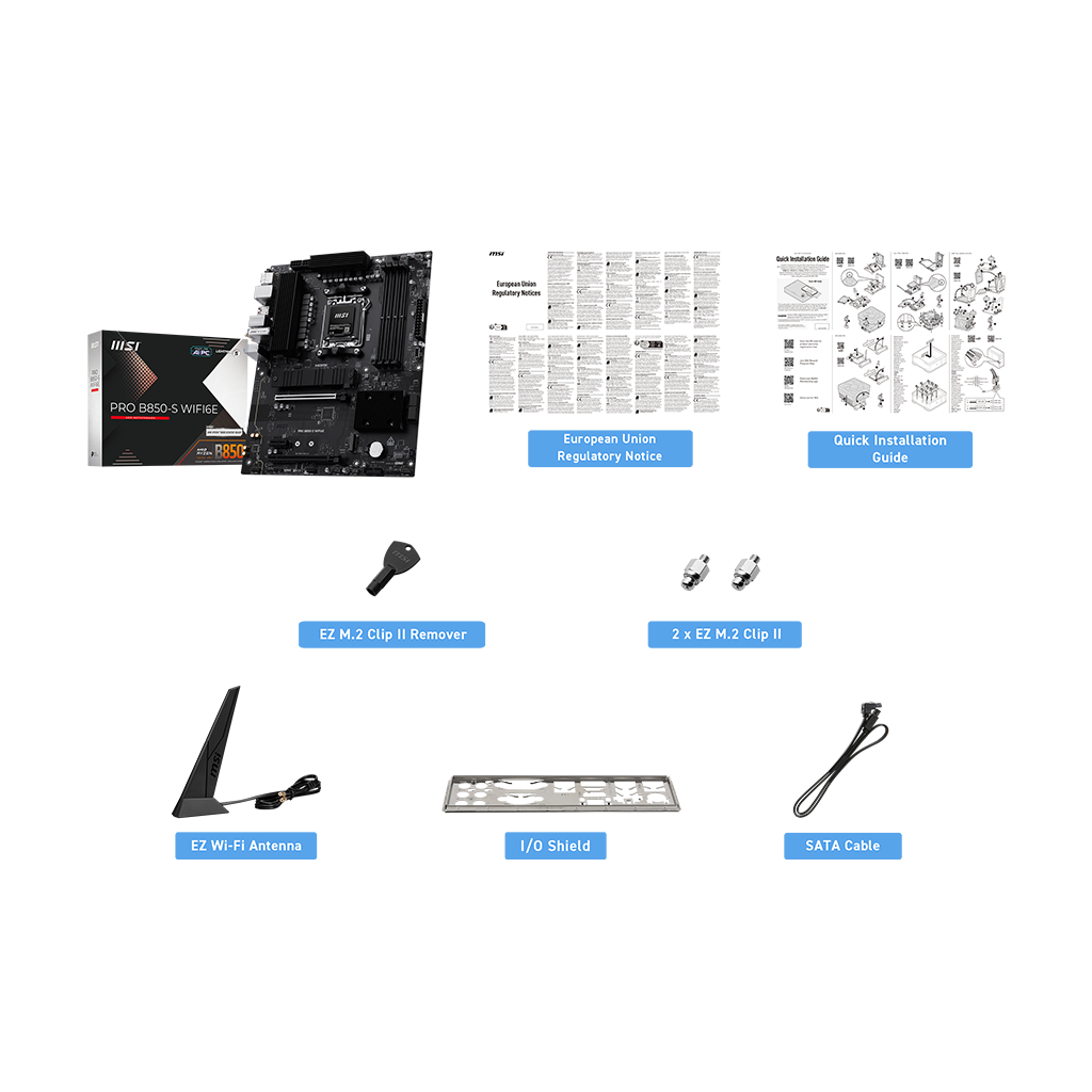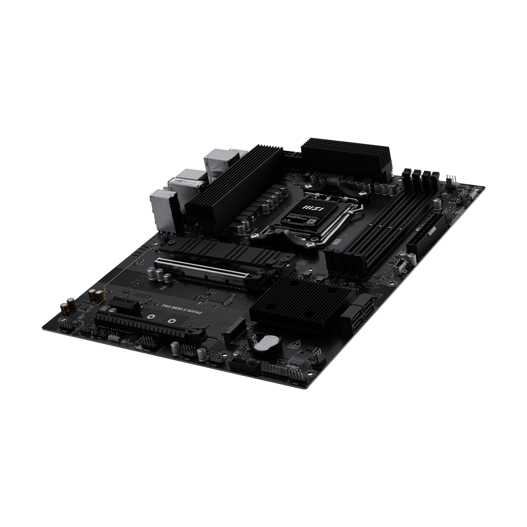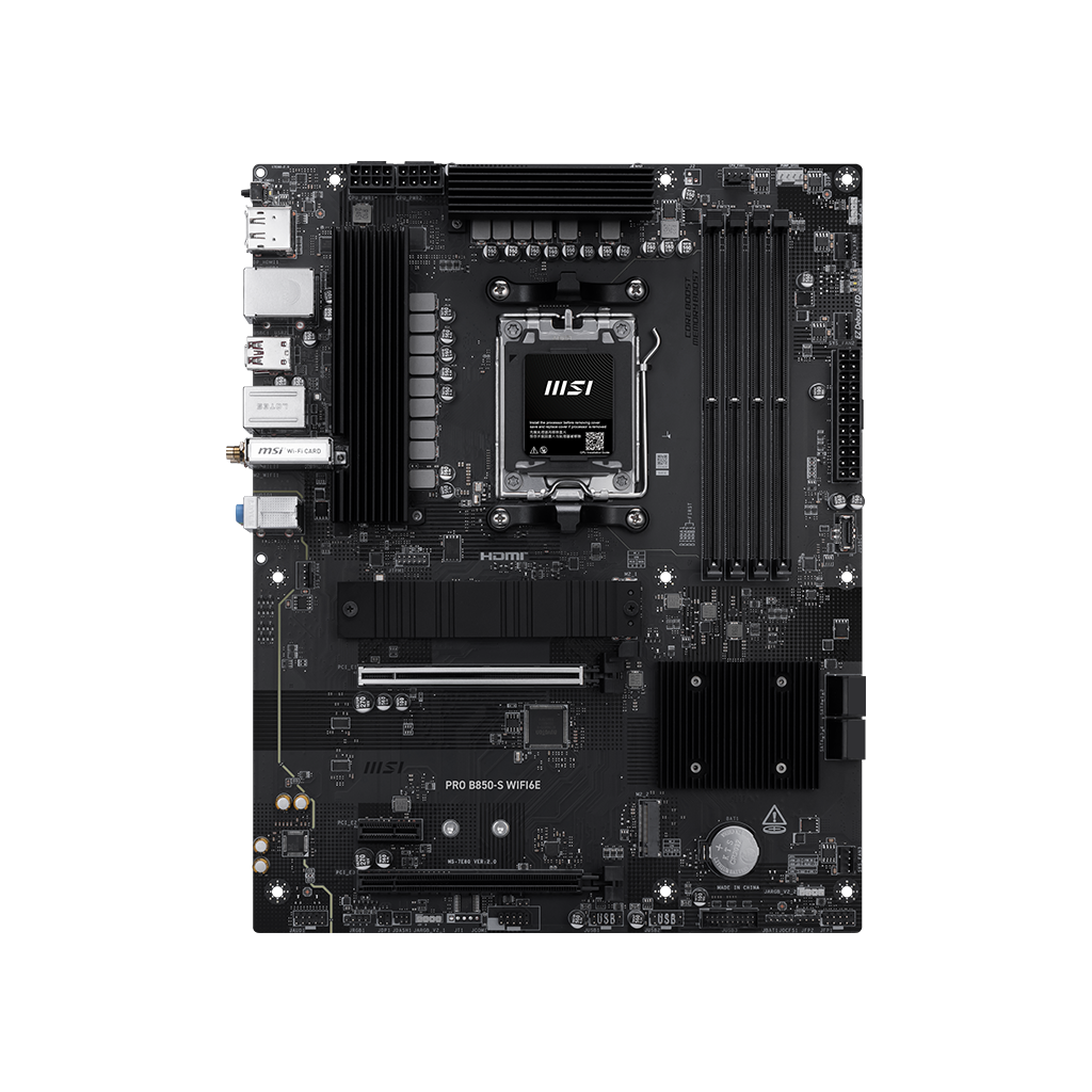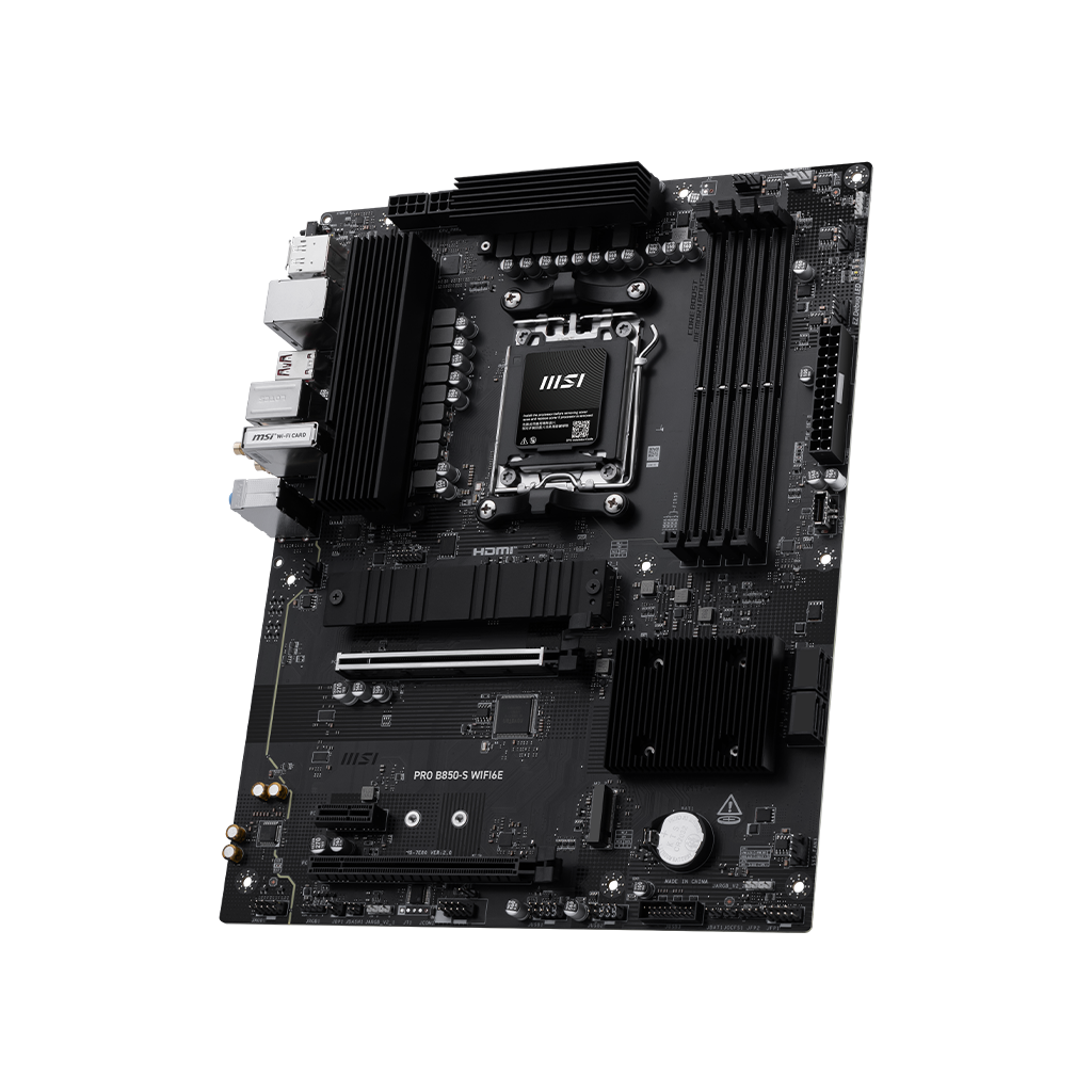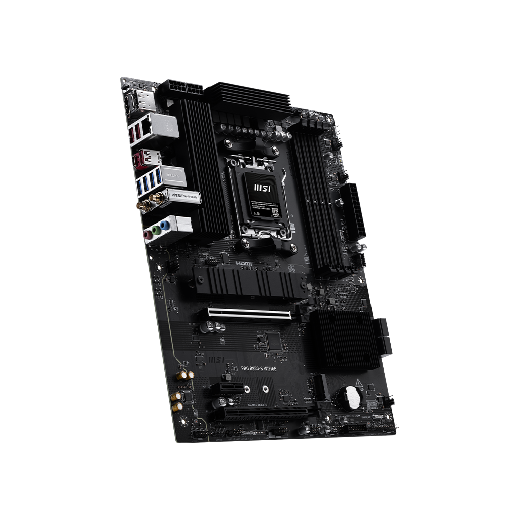 The PRO B850-S WIFI6E is a business-oriented ATX motherboard with a 12 Duet Rail Power System, constructed around the latest AMD B850 chipset which supports AMD Ryzen 9000 / 8000 / 7000 series desktop processors, featuring PCIe 5.0 M.2, 2.5G LAN, Wi-Fi 6E and DDR5 that delivers the capacity to support a broad spectrum of both cutting-edge and innovative hardware.