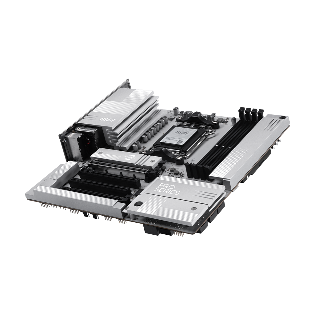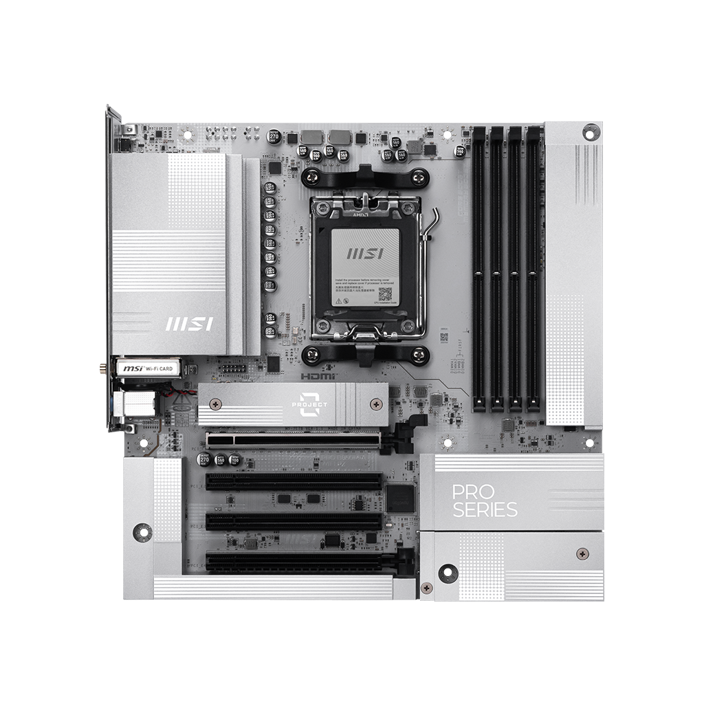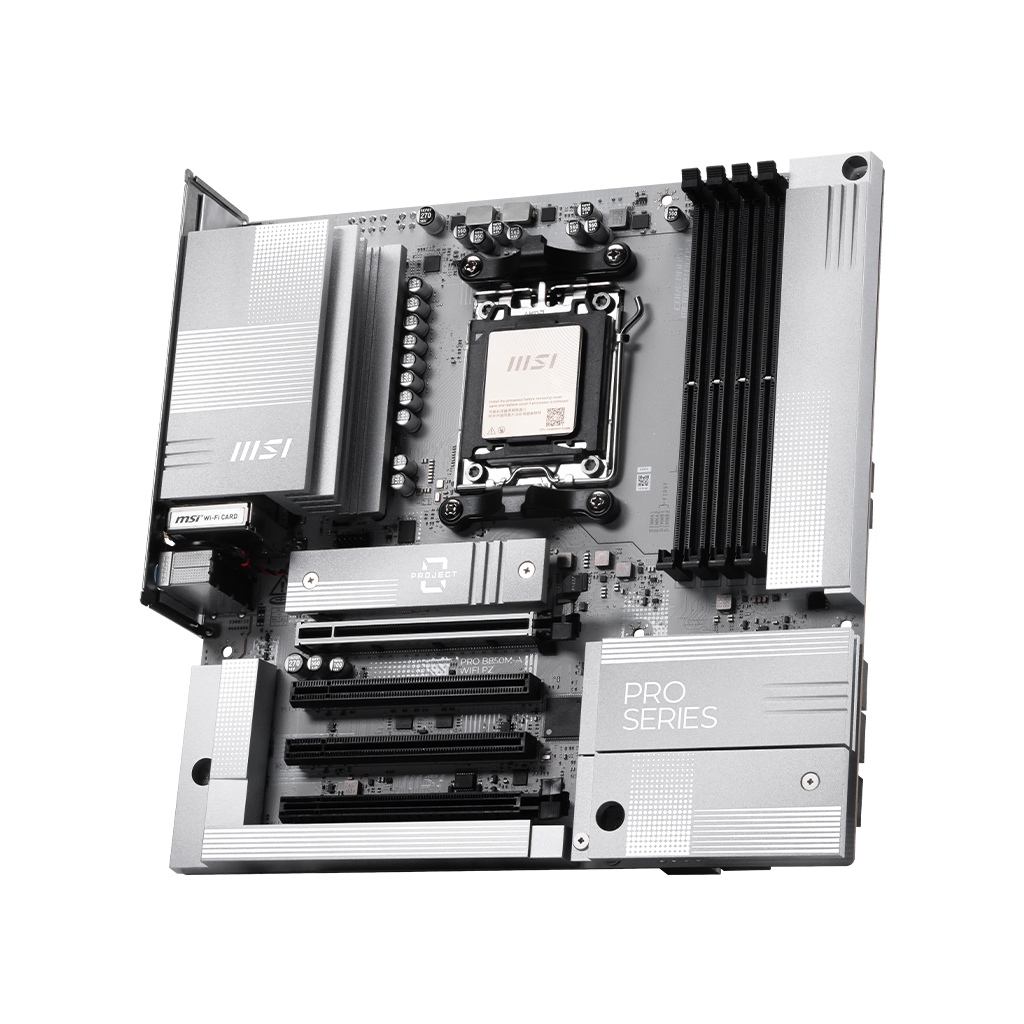 PRO B850M-A WIFI PZ offers a sleek design with a harmonious silver-white color scheme that perfectly matches white PC builds. Its innovative back-connect design reduces the complexity of cable management, resulting in an aesthetically pleasing appearance for the system. It is engineered with many exclusive features of MSI, Wi-Fi 7 with EZ Antenna, 5G LAN, PCIe 5.0 M.2, and Supplemental PCIe Power, ready for the AMD Ryzen™ 9000 series processors.