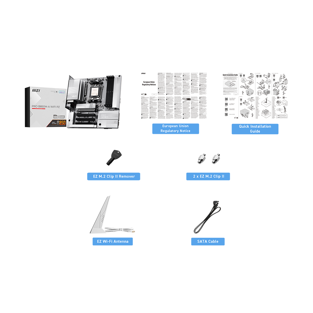 EZ DIY: EZ Link, EZ PCIe Release, EZ Magnetic M.2 Shield Frozr II, EZ M.2 Clip II and EZ Antenna.