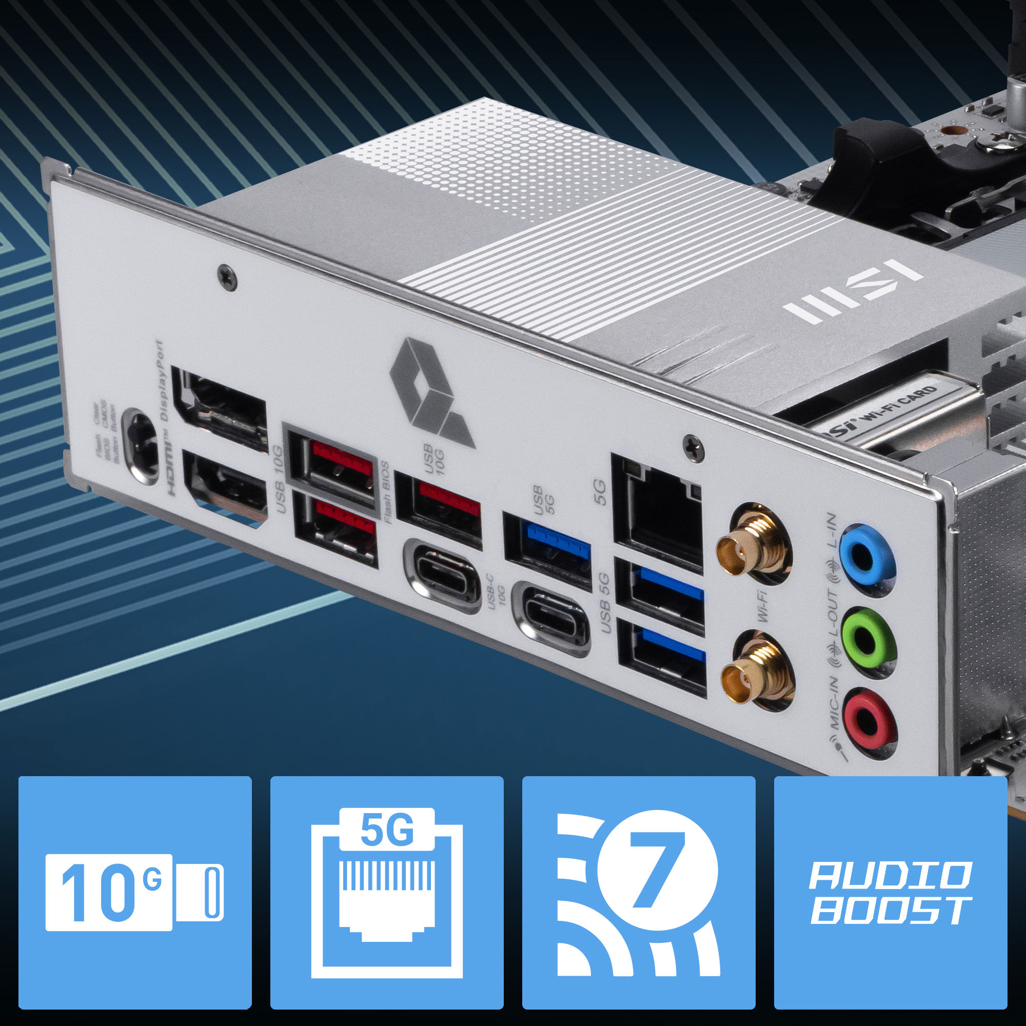 Ultra Connect: 10G LAN + 5G LAN, Full-speed Wi-Fi 7 Solution and USB4 - The latest solution for professional and multimedia use, delivering secure, stable, and high-speed networking and data transmission.