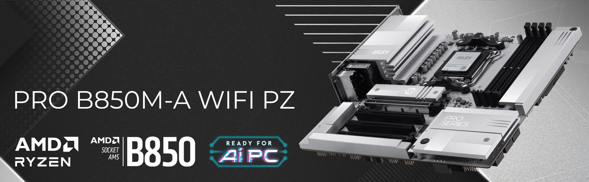 The PRO B850M-A WIFI PZ is a creation-oriented Micro-ATX motherboard, featuring the back-connect design, which allows for a cleaner front view and easier cable management. Constructed with the latest AMD B850 chipset which supports AMD Ryzen 9000 / 8000 / 7000 series desktop processors, the PRO B850M-A WIFI PZ features PCIe 5.0, 5G LAN, Wi-Fi 7, DDR5 and Frozr design that delivers the capacity to support a broad spectrum of both cutting-edge and innovative hardware.