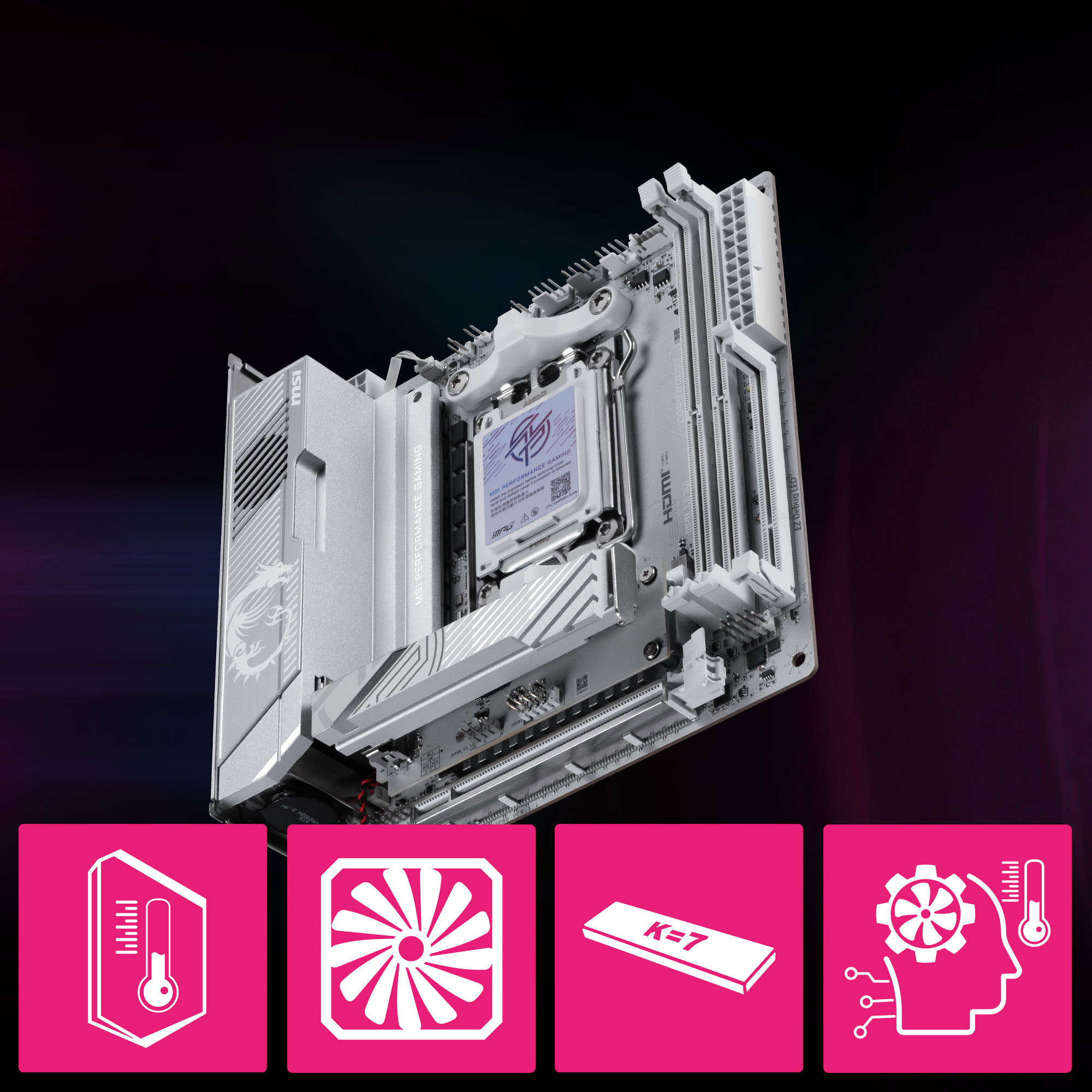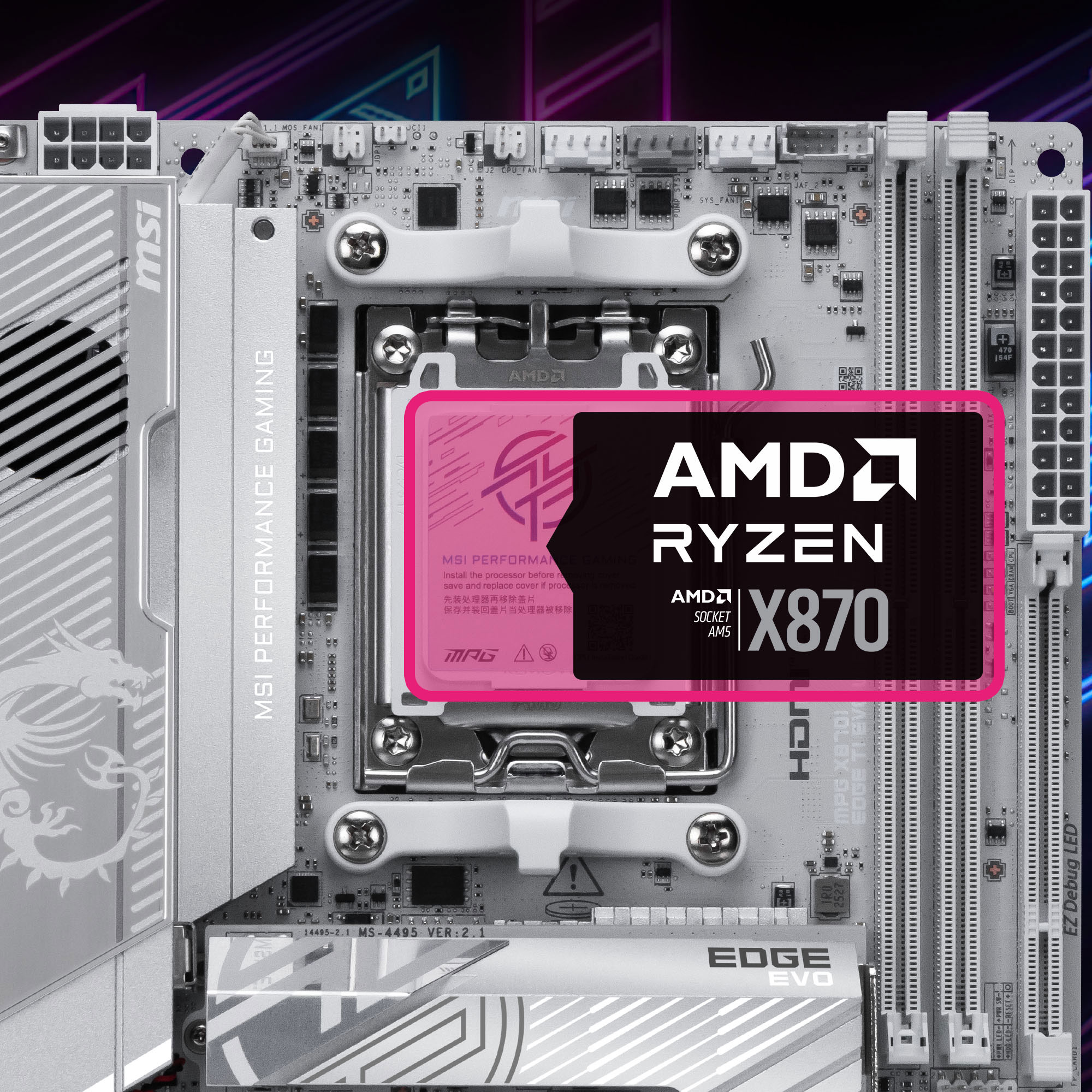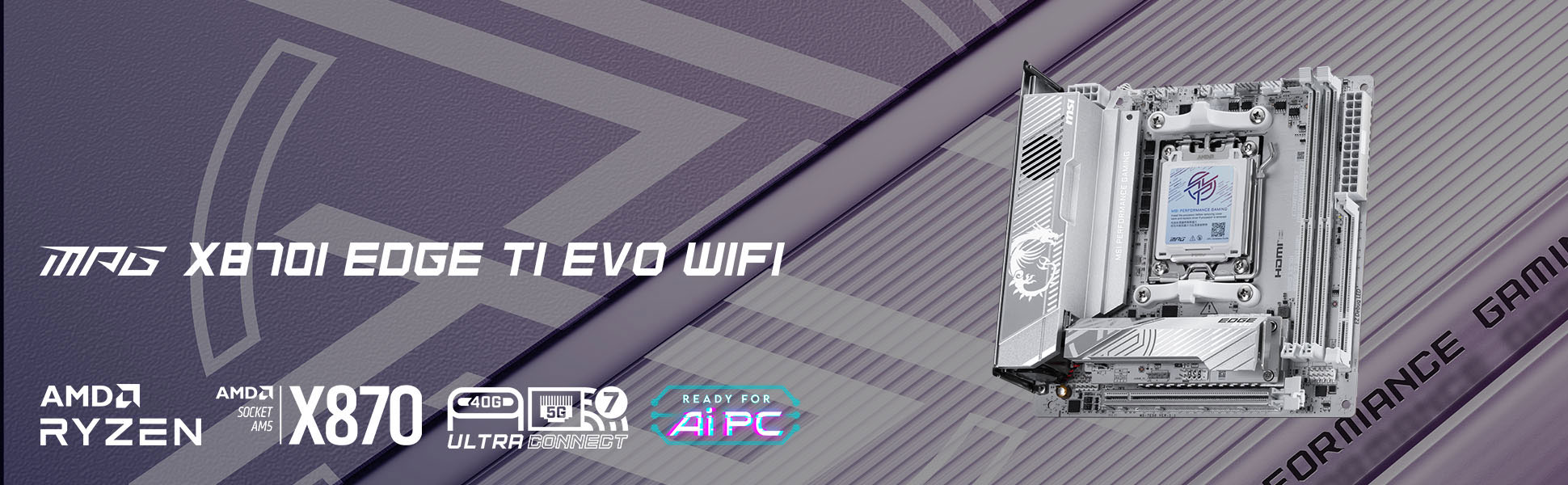 The MPG X870I EDGE TI EVO WIFI is a gaming oriented ITX motherboard with a 8 Duet Rail Power System, constructed around the latest AMD X870 chipset which supports AMD Ryzen 9000 / 8000 / 7000 series desktop processors, featuring PCIe 5.0, 5G LAN, Wi-Fi 7, DDR5 and premium Frozr design that delivers both performance and style.