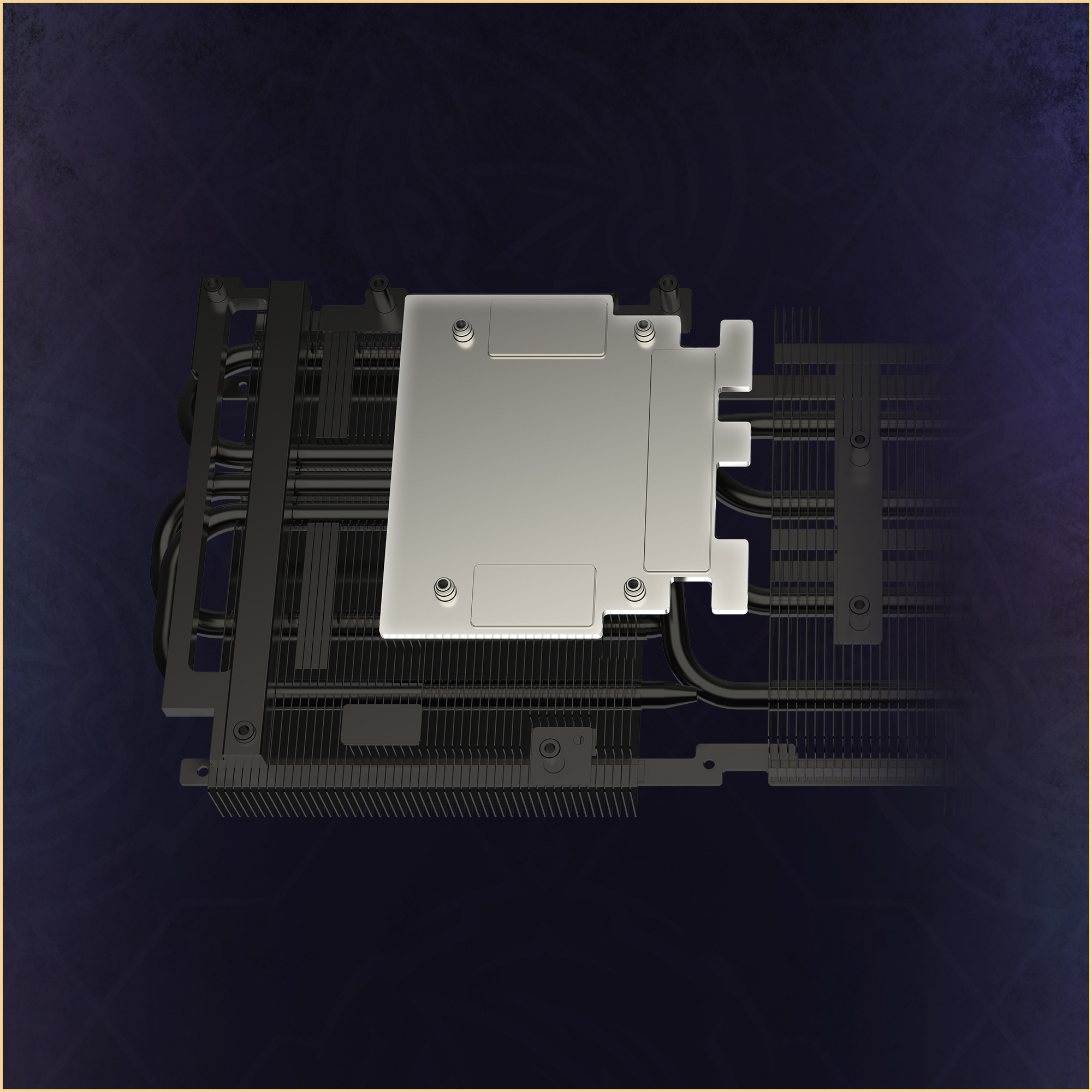 Heat from the GPU and memory modules is quickly captured by a solid nickel-plated copper baseplate and rapidly transferred to the core pipes.