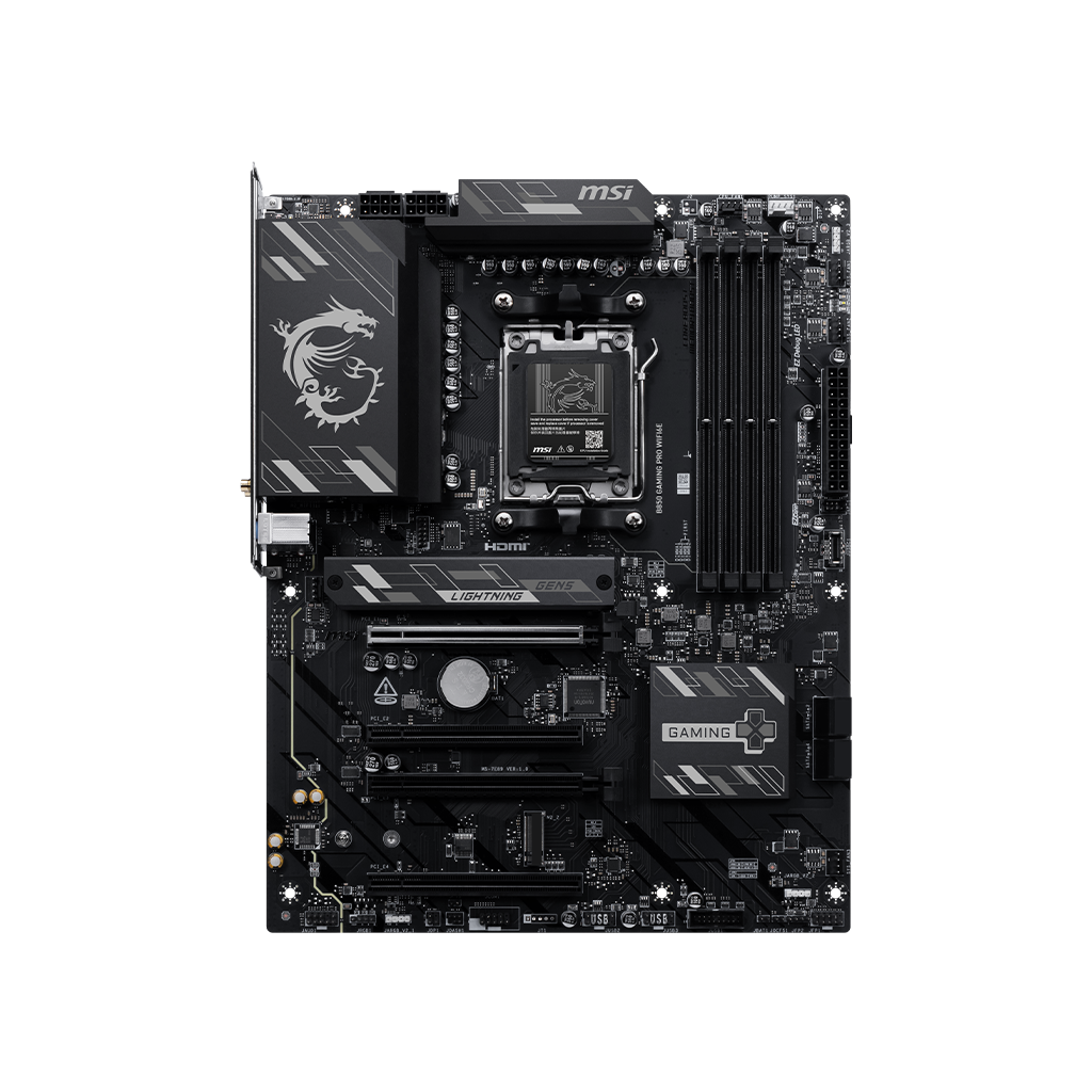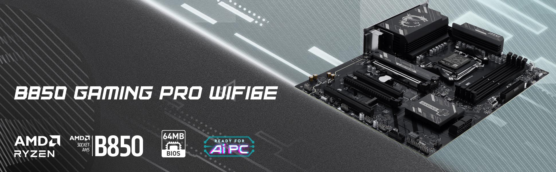 The B850 GAMING PRO WIFI6E is a gaming oriented ATX motherboard that is constructed with the latest AMD B850 chipset which supports AMD Ryzen 9000 / 8000 / 7000 series desktop processors, featuring PCIe 5.0 M.2 solution, 2.5G LAN, Wi-Fi 6E and DDR5 that balances both value and premium hardware.