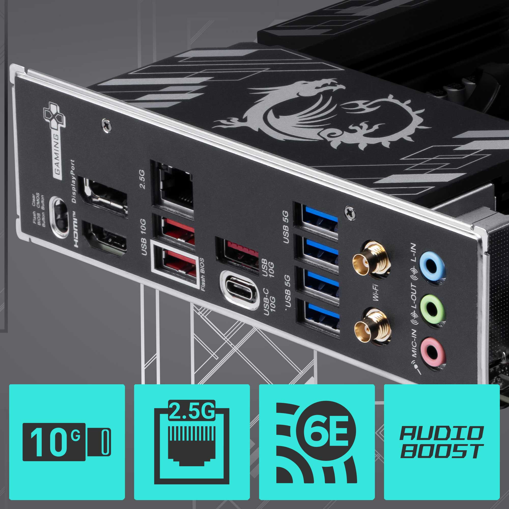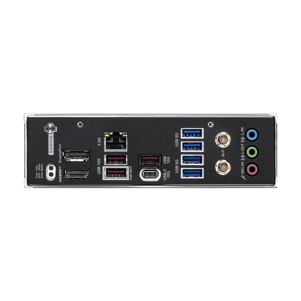 | I/O (Rear) | Clear CMOS Button DisplayPort 1.4 2.5G LAN USB 5Gbps (Type-A) Wi-Fi / Bluetooth Audio Connectors Flash BIOS Button HDMI™ USB 10Gbps (Type-A) USB 10Gbps (Type-C) USB 5Gbps (Type-A) |