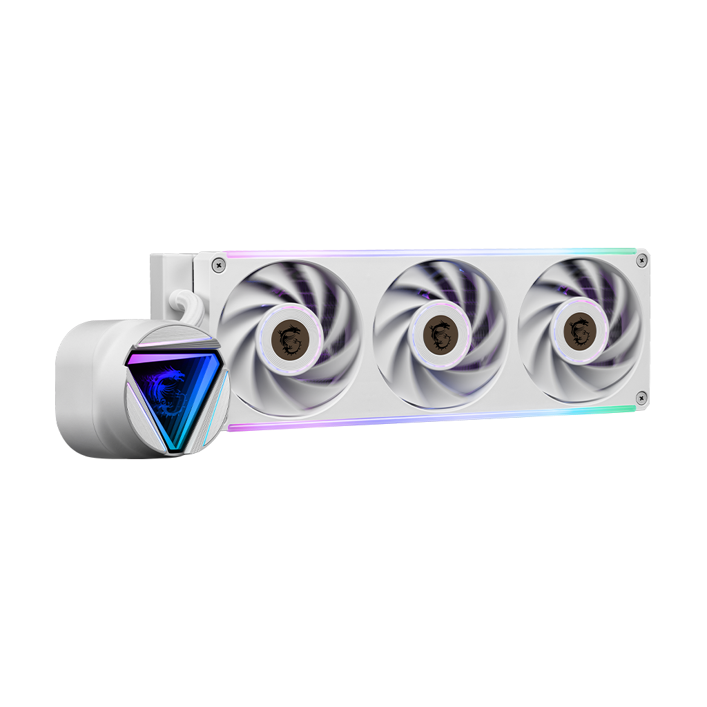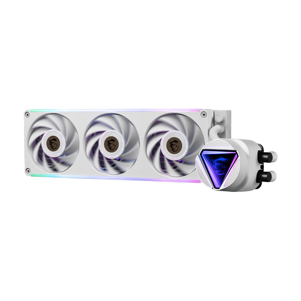 The MAG CORELIQUID C360 V2 WHITE liquid cooler provides out of the box support for AMD Ryzen 7000 Series processors. The liquid cooler provides out of box support for LGA 1851. Each set includes two tool-free, swappable water blocks for easy customization. Radiator fans use a single frame, allowing fan speed and ARGB to be controlled with only two cables. A durable three phase motor at the core of the pump generates minimal vibrations for long-lasting operation. Mount the cold plate at any orientation, turn the blockhead up to 270 degrees, and keep it upright. Show off your colors with full ARGB customization on the fans and cooling block.