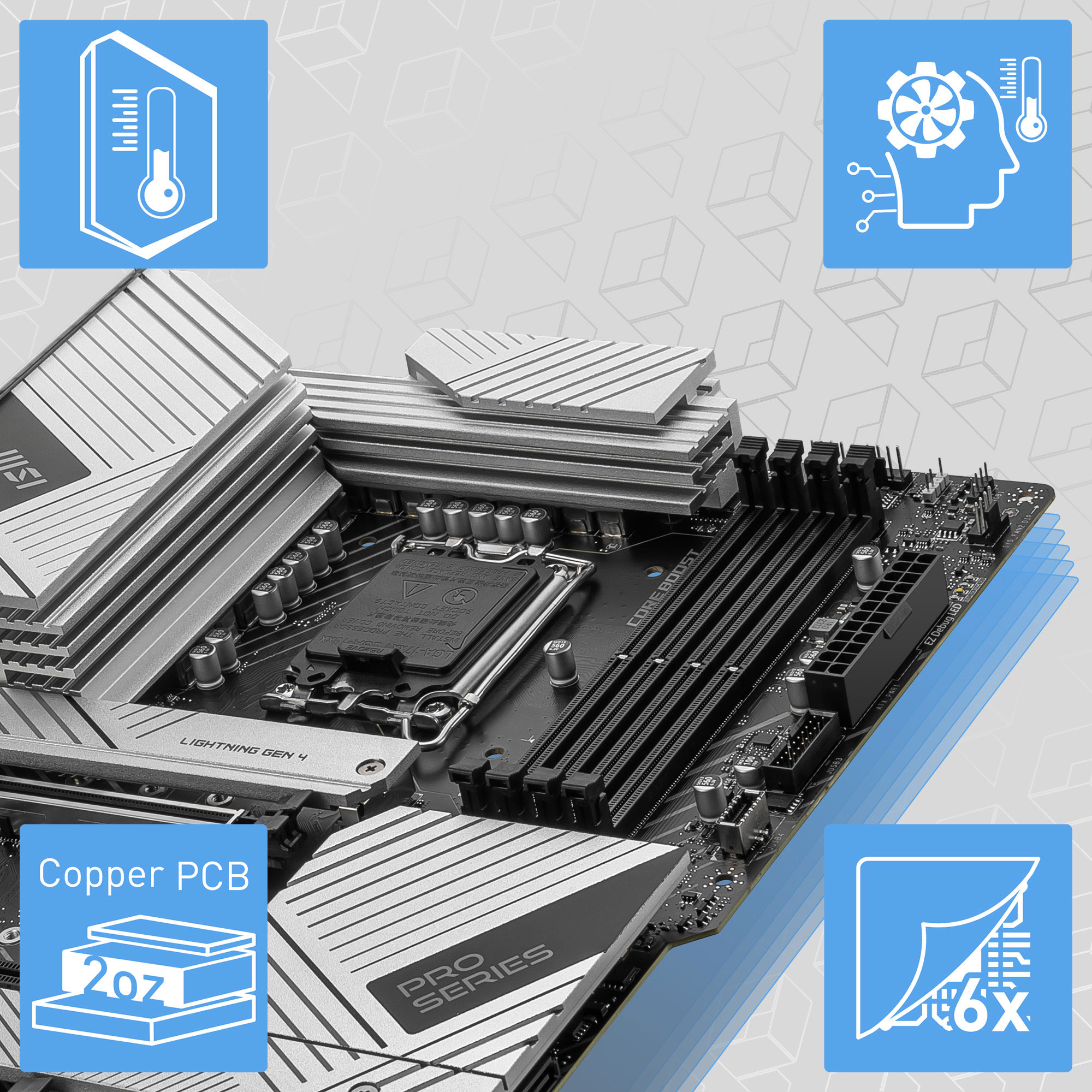 With its dual 8-pin power connectors and exclusive Core Boost technology, the PRO Z790-A WIFI II is able to sustain heavy CPU power loads to support system-demanding work settings:
